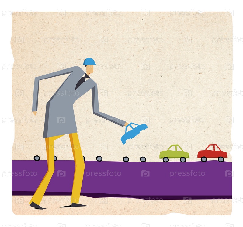 Мужчина в сером костюме, рабочий на фабрике игрушечных автомобилей