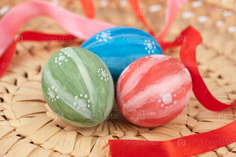 Раскрашенные пасхальные яйца в плетеной корзинке