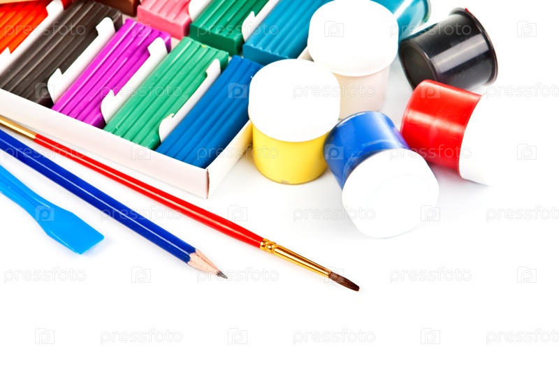 Пластилин, краски, карандаш и кисточка на белом фоне