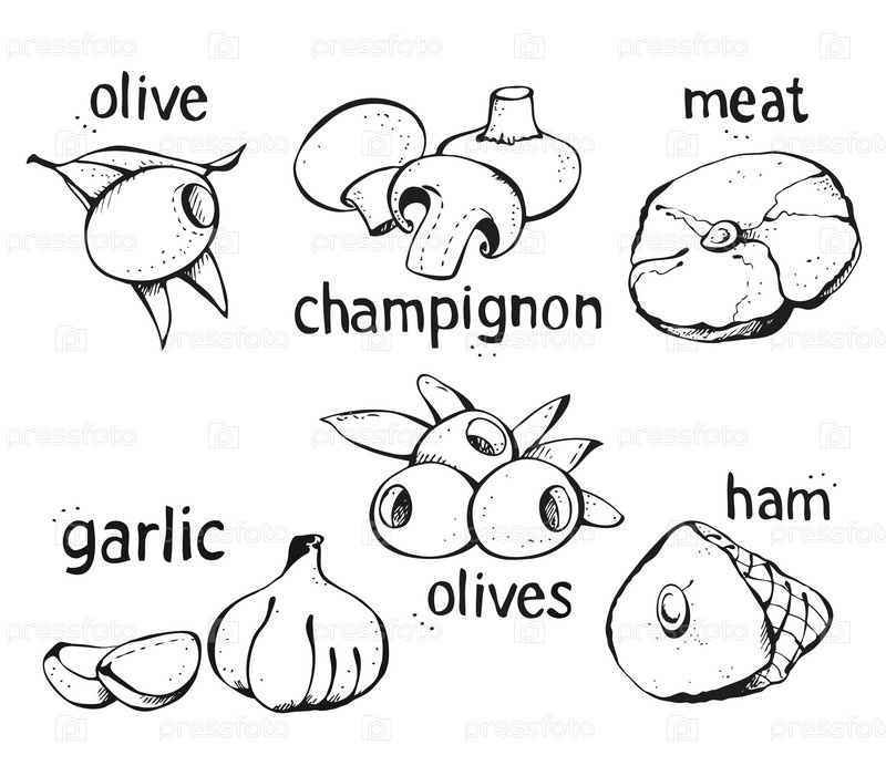 Набор продуктов для приготовления пиццы, черно-белая иллюстрация