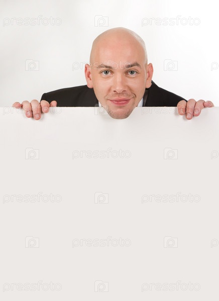 Изображение красивого мужчины, который смотрит из-за белой перегородки