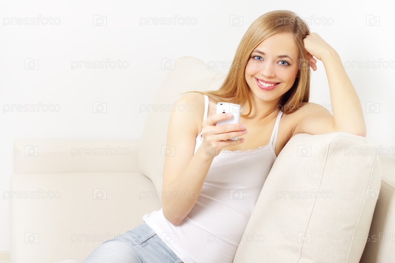 Девушка с телефоном на диване на светлом фоне