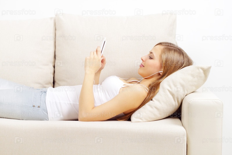Девушка с телефоном на диване на светлом фоне