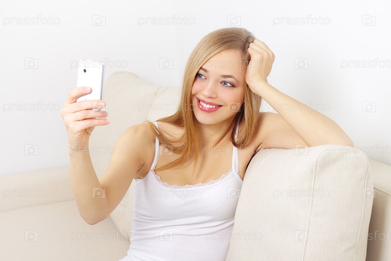 Девушка с телефоном на диване на светлом фоне