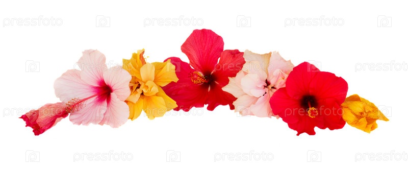 Бордюр из разноцветных цветков гибискуса, изолированный на белом фоне