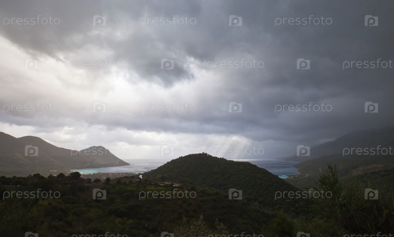 Солнце пробивается через серое небо в горах