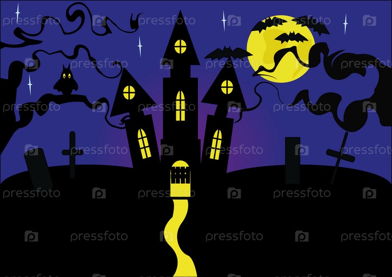 Мультипликационное изображение замка на кладбище,летучих мышь на фоне луны