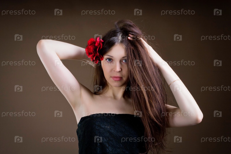 Портрет привлекательной женщины с цветком в волосах