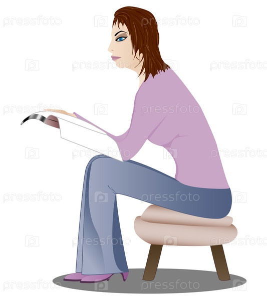 Женщина сидит на табурете и читает журнал