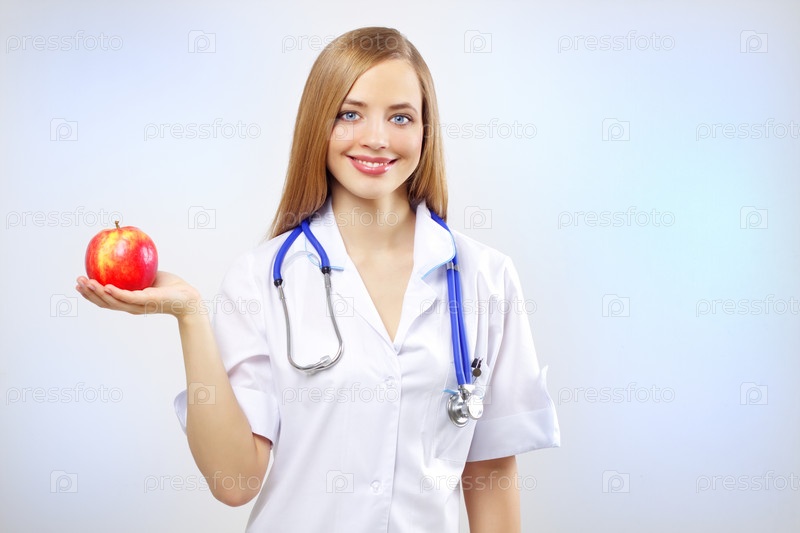 Портрет счастливой женщины-врача со стетоскопом и яблоком