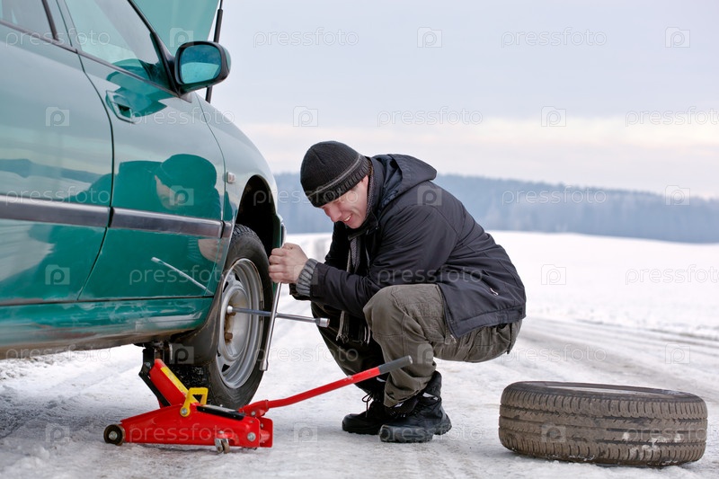 Мужчина меняет автомобильное колесо зимой