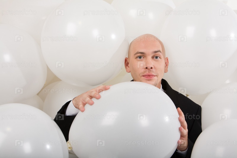 Фото привлекательного мужчины, держащего в руках большой белый воздушный шар и смотрящего на камеру