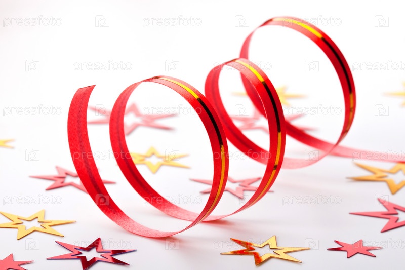 Красная лента и конфетти на белом фоне