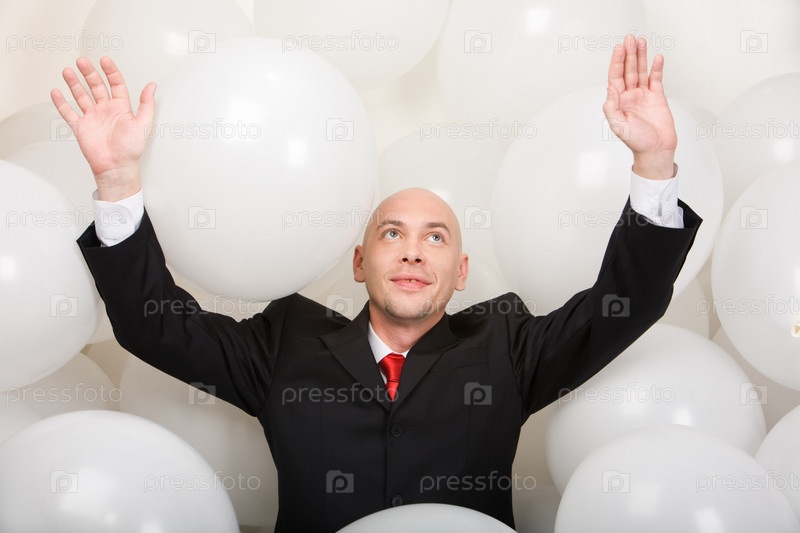 Фото радостного мужчины в костюме внутри воздушных шаров, поднимающего руки