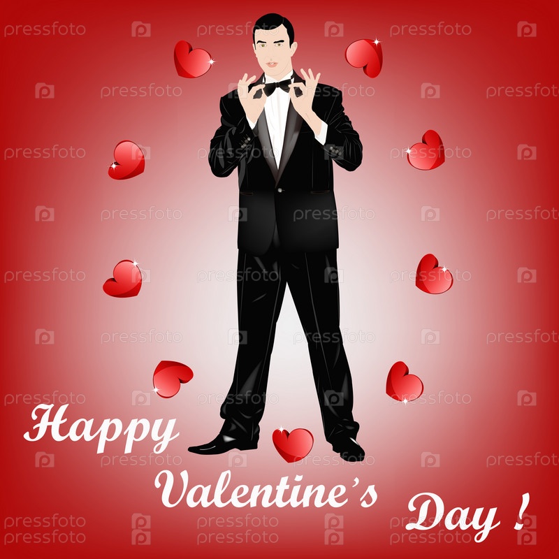 Открытка на день святого Валентина с мужчиной на красном фоне среди сердечек