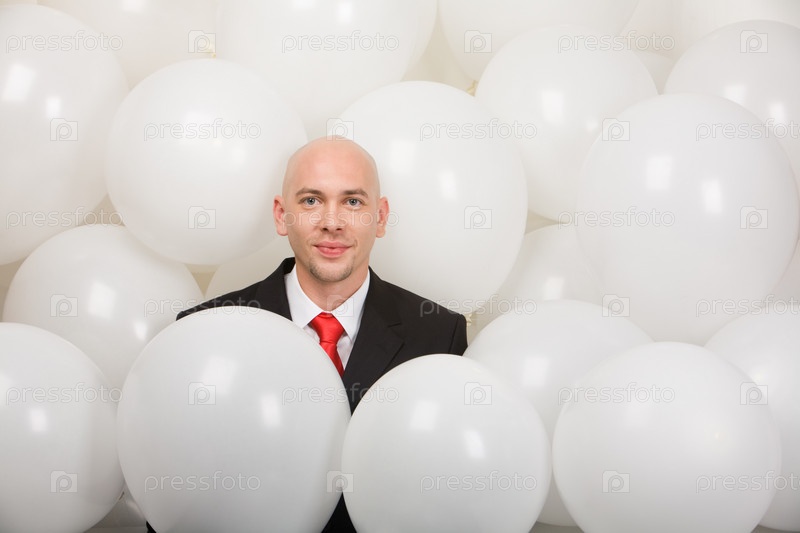 Мужчина, окруженный воздушными шарами на корпоративной вечеринке