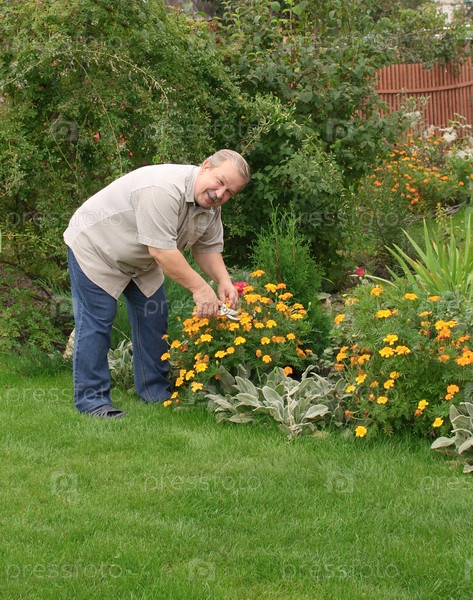 Пожилой мужчина, ухаживающий за клумбой