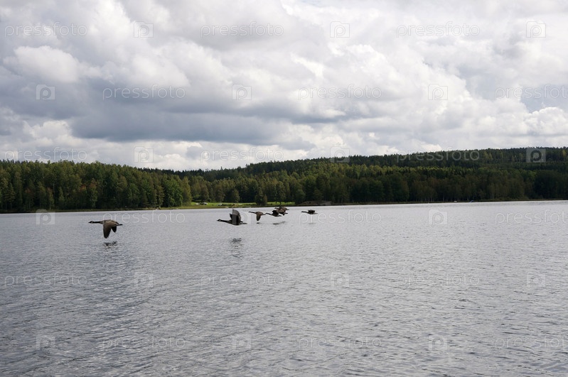 Утки летят над водой на фоне леса и облаков