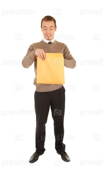 Молодой человек открывает желтый пакет, изолированный на белом