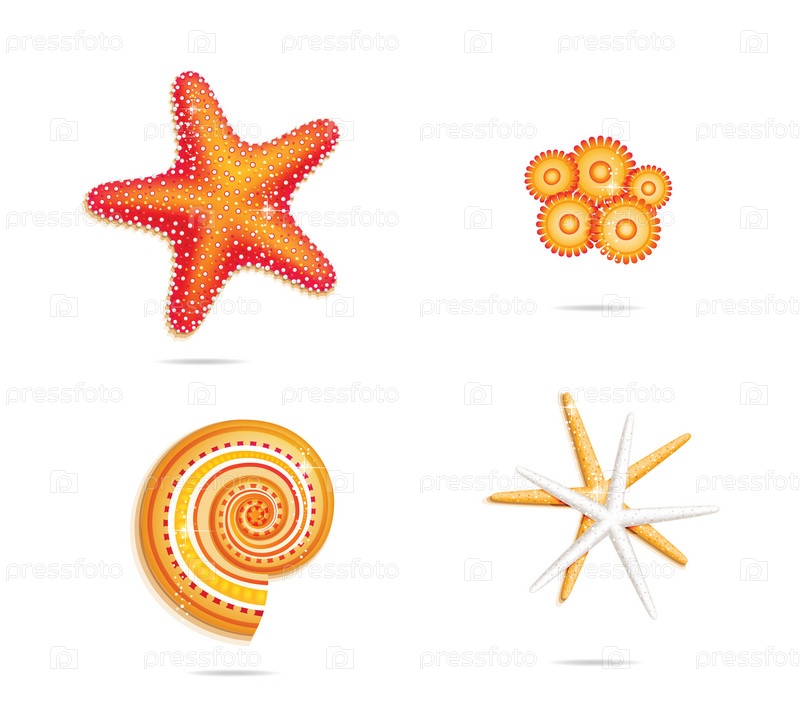 Морская звезда и морские раковины на белом фоне