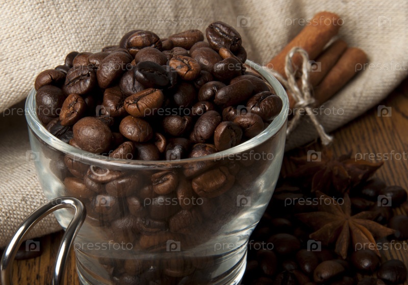 Зерна кофе в стеклянной чаше, и корица на холщовой ткани