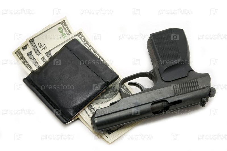 Американские доллары, портмоне и пистолет, изолированные на белом фоне