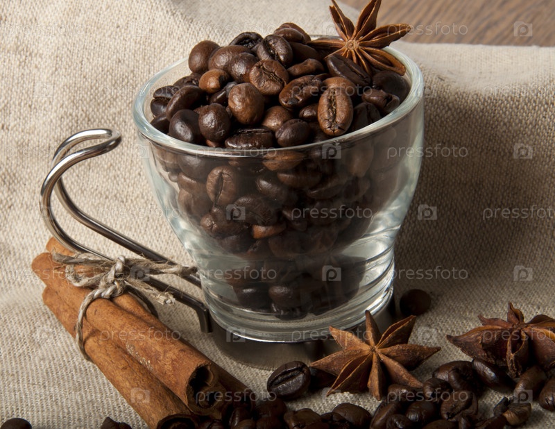Зерна кофе в стеклянной чаше, и корица на холщовой ткани