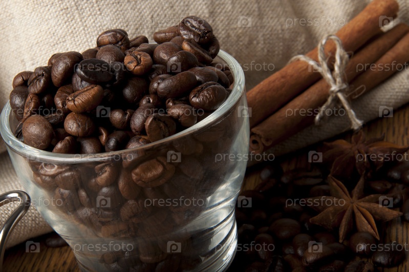Зерна кофе в стеклянной чаше, и корица на холщовой ткани