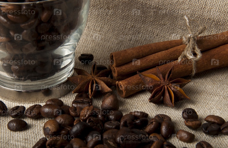 Зерна кофе в стеклянной чаше, и корица на холщовой ткани