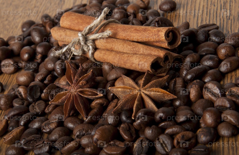 Зерна кофе и корица на столе