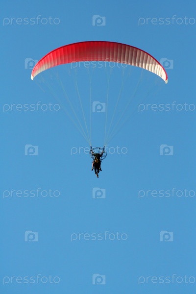 Парашютист под тонким красным куполом на фоне голубого неба