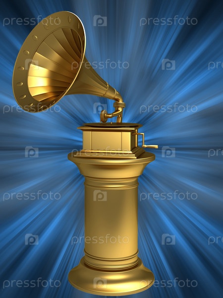 Золотой граммофон на подставке на абстрактном фоне с лучами