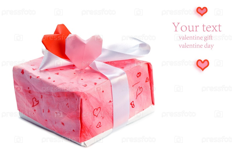 Розовая подарочная коробка с сердцами и ваш текст, изолированно на белом фоне