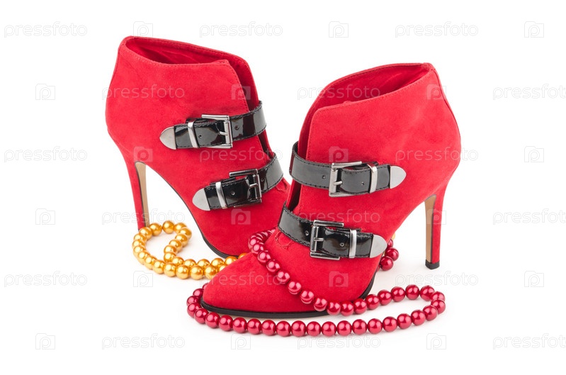 Женские красные ботинки на высоком каблуке и жемчужные ожерелья