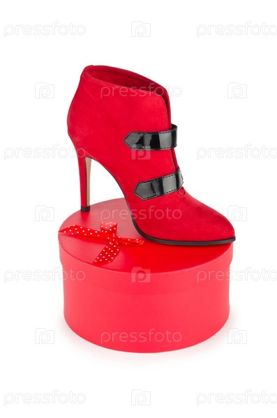 Женский красный ботинок на высоком каблуке и подарочная коробка