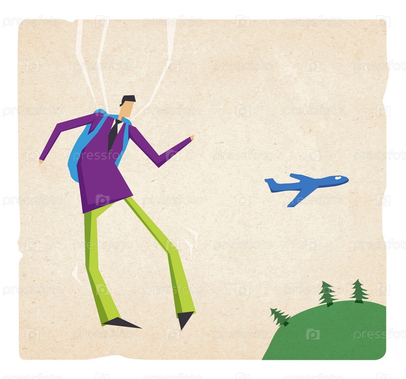 Человек с парашютом и самолет над горой, иллюстрация на старой бумаге