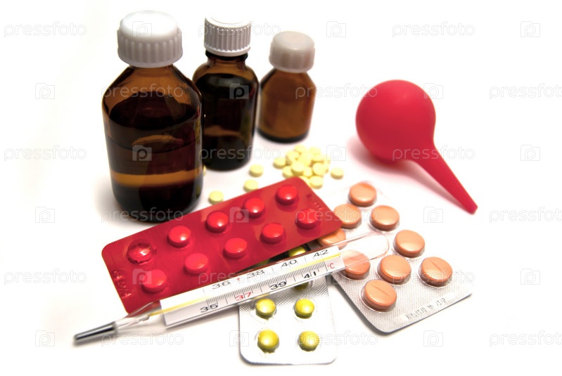 Лекарства, термометр и клизма на белом фоне