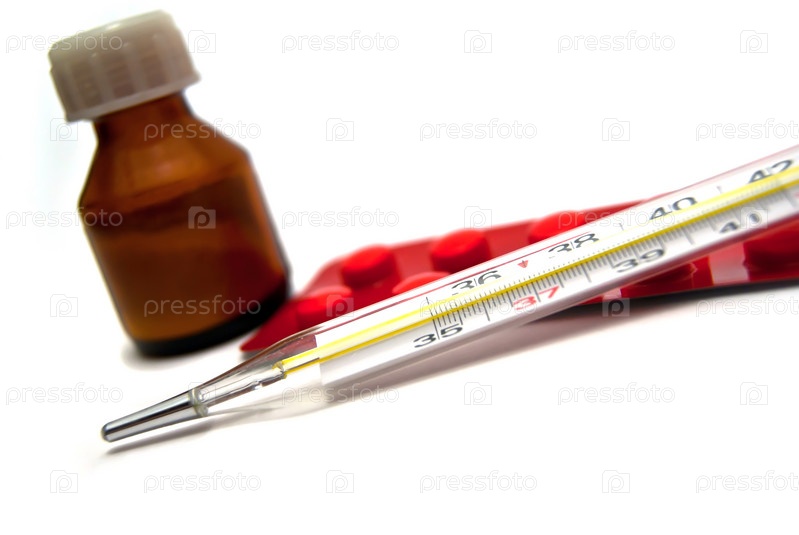 Лекарства и термометр на белом фоне
