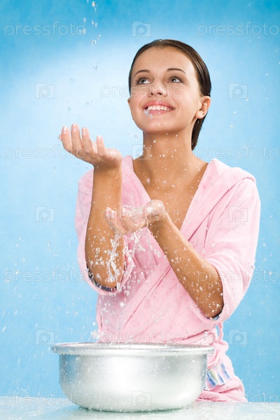 Портрет счастливой женщины в розовом халате, брызгая водой на синем фоне