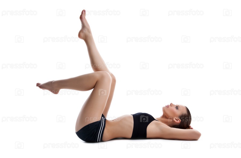 Красивая молодая женщина в одежде для фитнеса на белом фоне