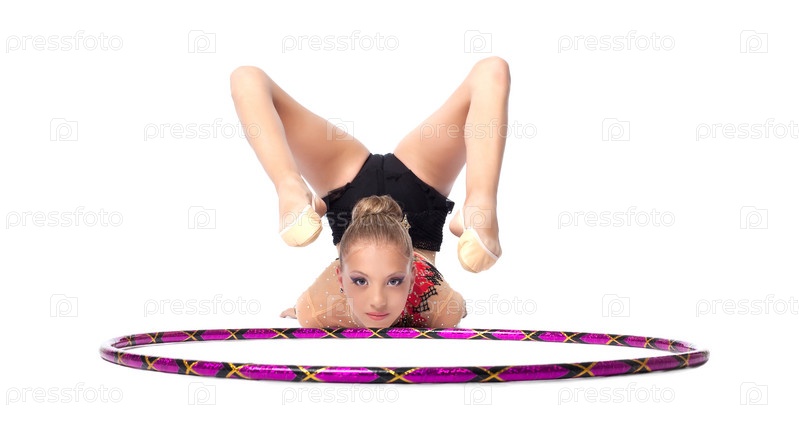 Красивая юная гимнастка с обручем на белом фоне