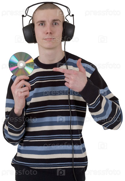 Молодой парень с наушниками на голове и компакт-диском в руке