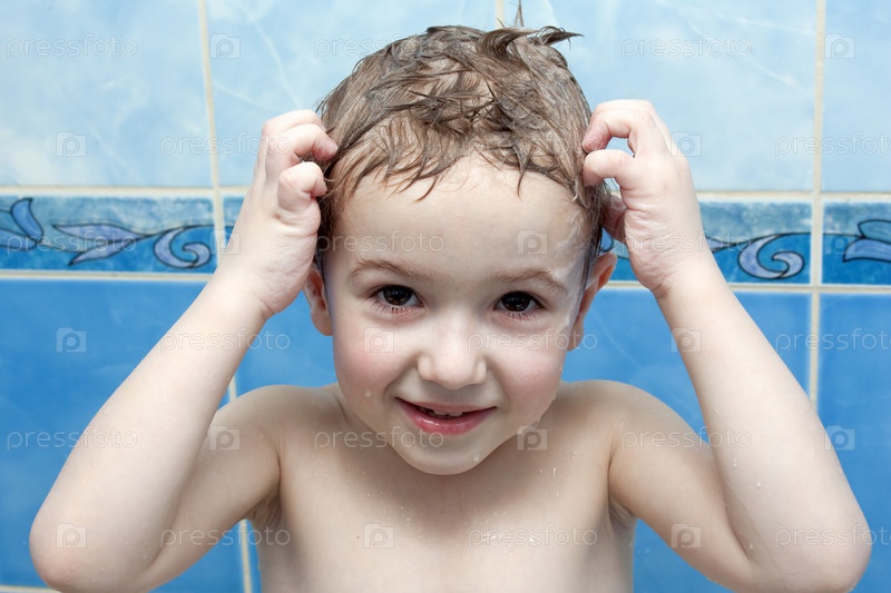 Красивый мальчик купается и моет голову шампунем