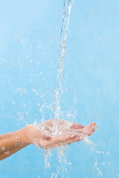 Человеческие ладони ловят брызги чистой воды на синем фоне