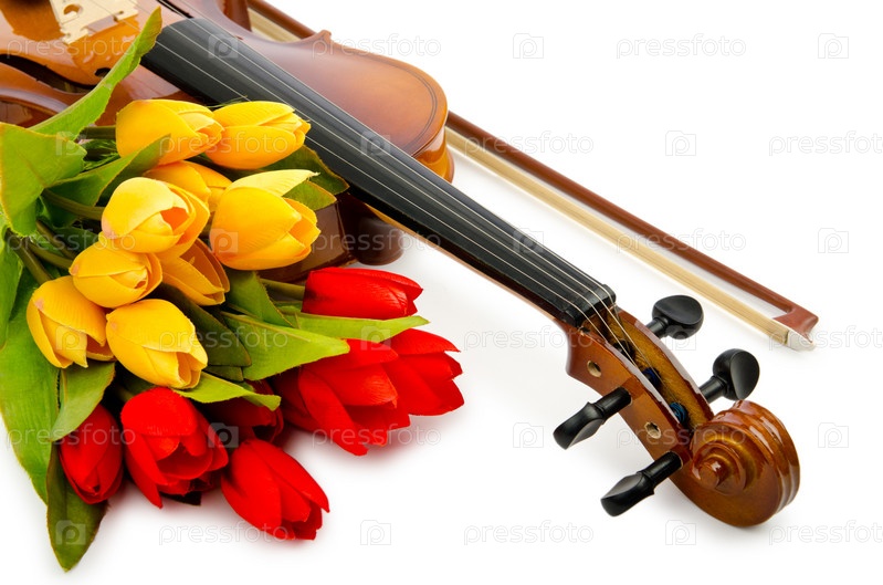 Скрипка и тюльпаны на белом фоне