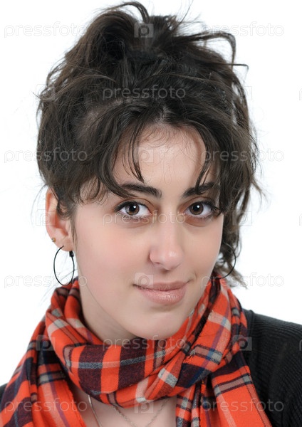 Портрет молодой брюнетки с оранжевым шарфом на шее, изолированно на белом фоне