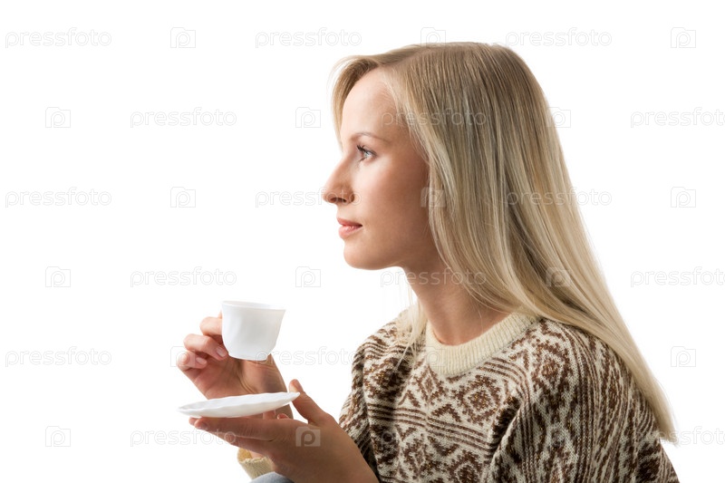 Профиль блондинки, которая смотрит издалека во время чашечки кофе