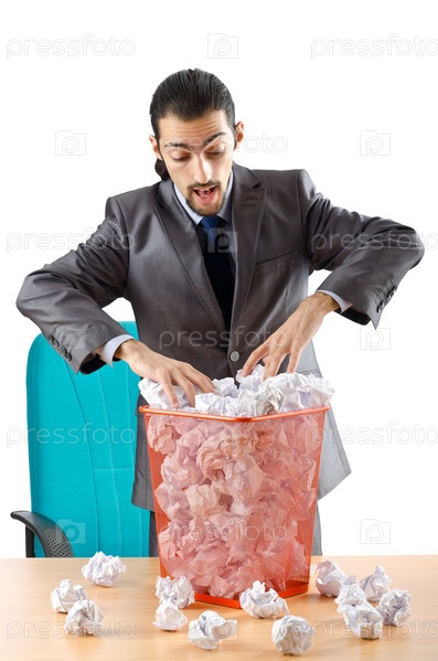 Человек с большим количеством выброшенной бумаги