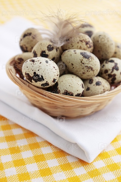Перепелиные яйца в корзине с перьями