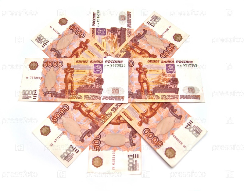 Российские банкноты на белом фоне